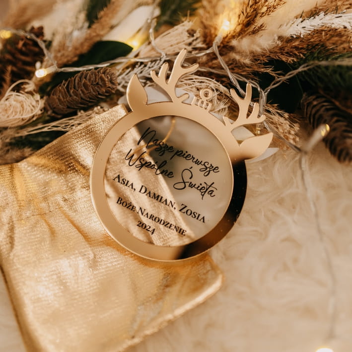 - Unikalna personalizacja: Na matowej powierzchni nadrukowany tekst: ,,Nasze pierwsze Wspólne Święta" + imiona całej rodziny + Boże Narodzenie 2024