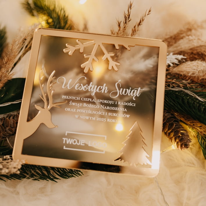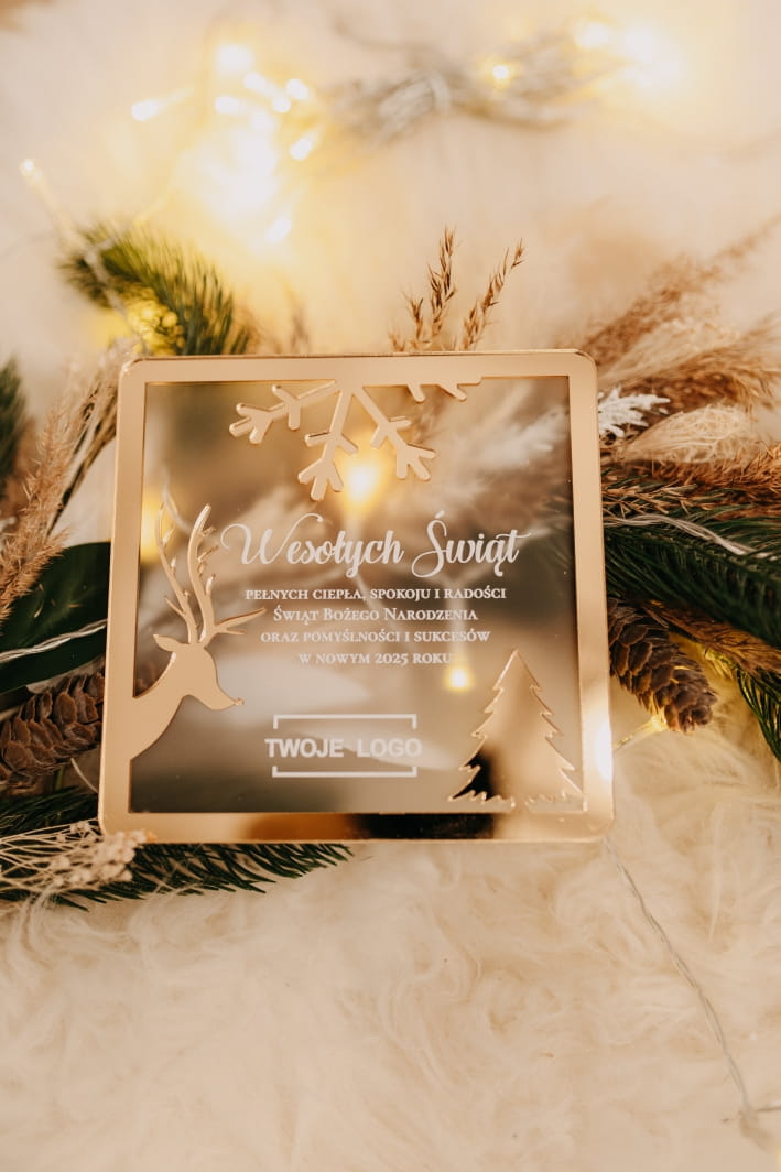 Nasza akrylowa kartka świąteczna to połączenie nowoczesnego designu i personalizacji, które idealnie wpasuje się w świąteczny klimat Twojej firmy.