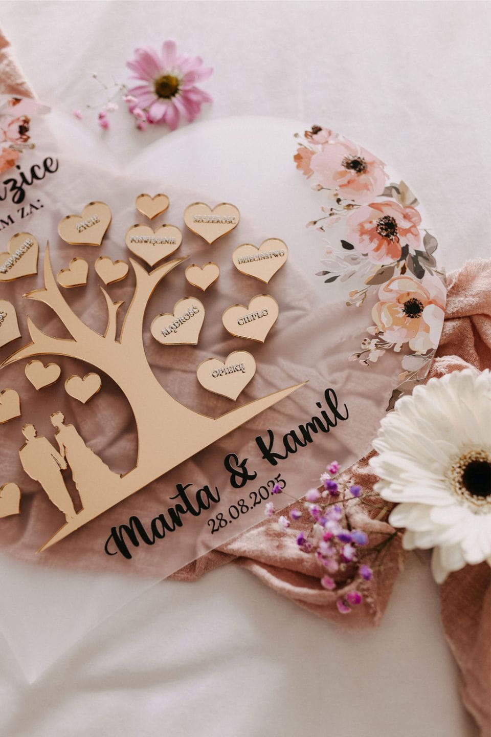 Lustrzane serduszka z hasłami wdzięczności – subtelne, eleganckie i pełne emocji.