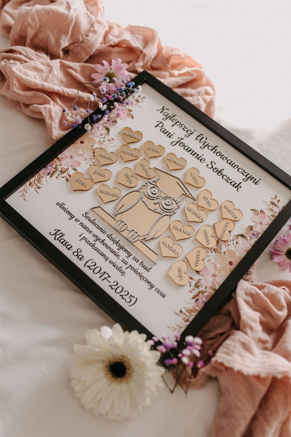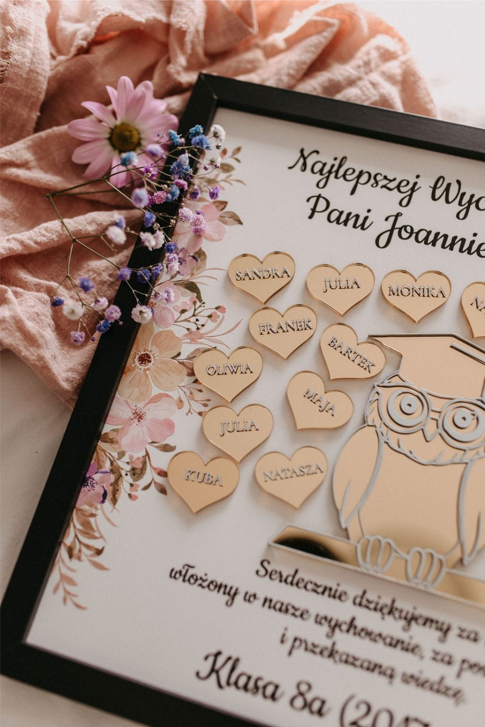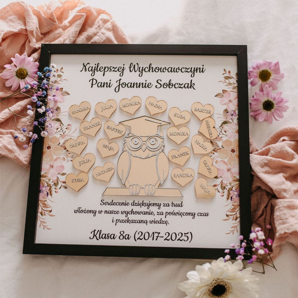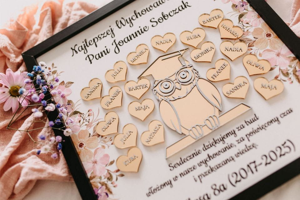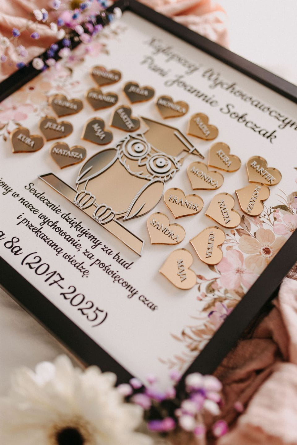 Podaruj nauczycielowi pamiątkę, która na zawsze pozostanie w jego sercu! Elegancka ramka z lustrzaną sową i serduszkami z imionami dzieci to wyjątkowy gest wdzięczności za trud, cierpliwość i pasję w nauczaniu.