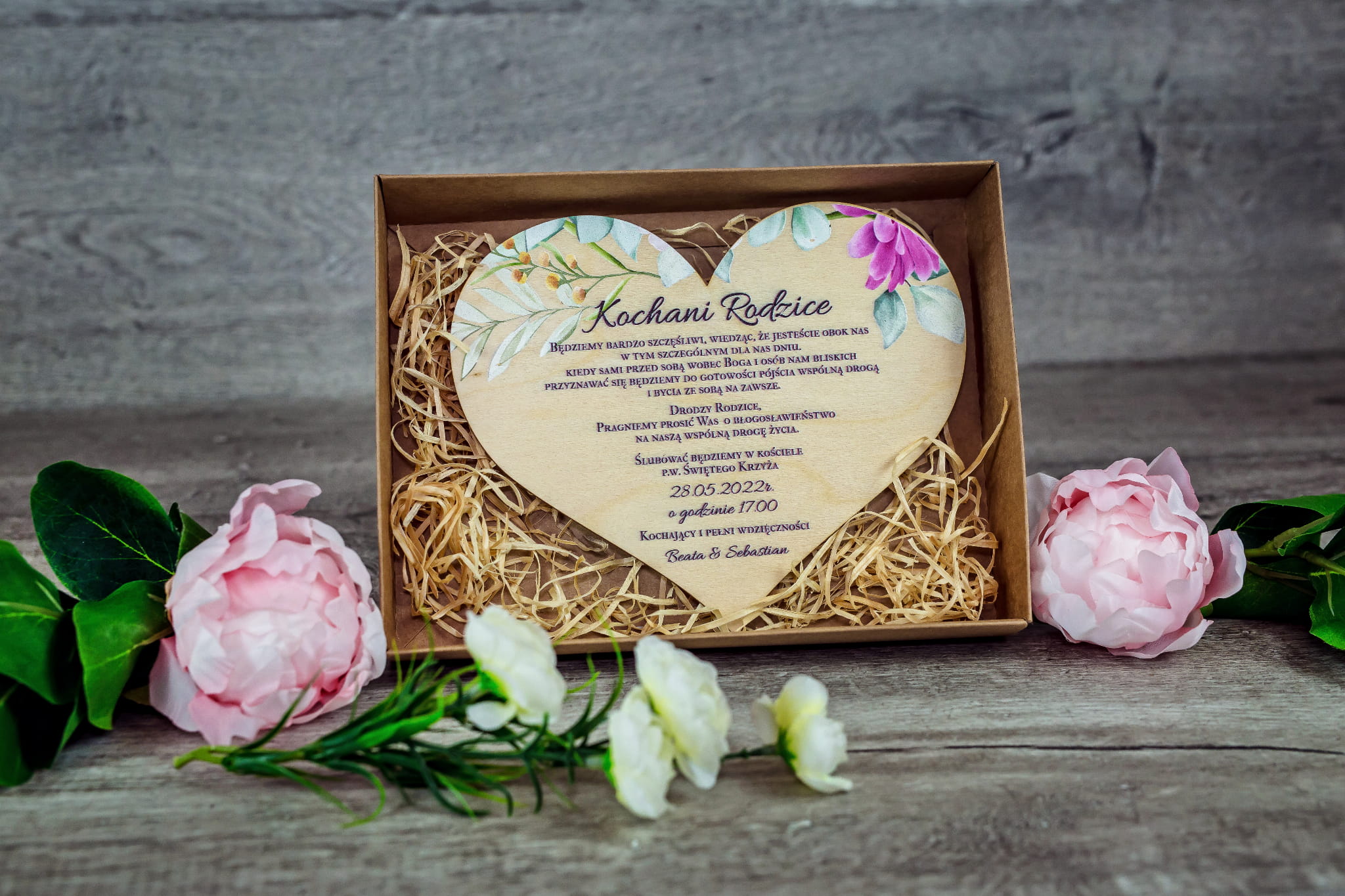 w postaci drewnianego serca z tekstem dedykacyjnym.