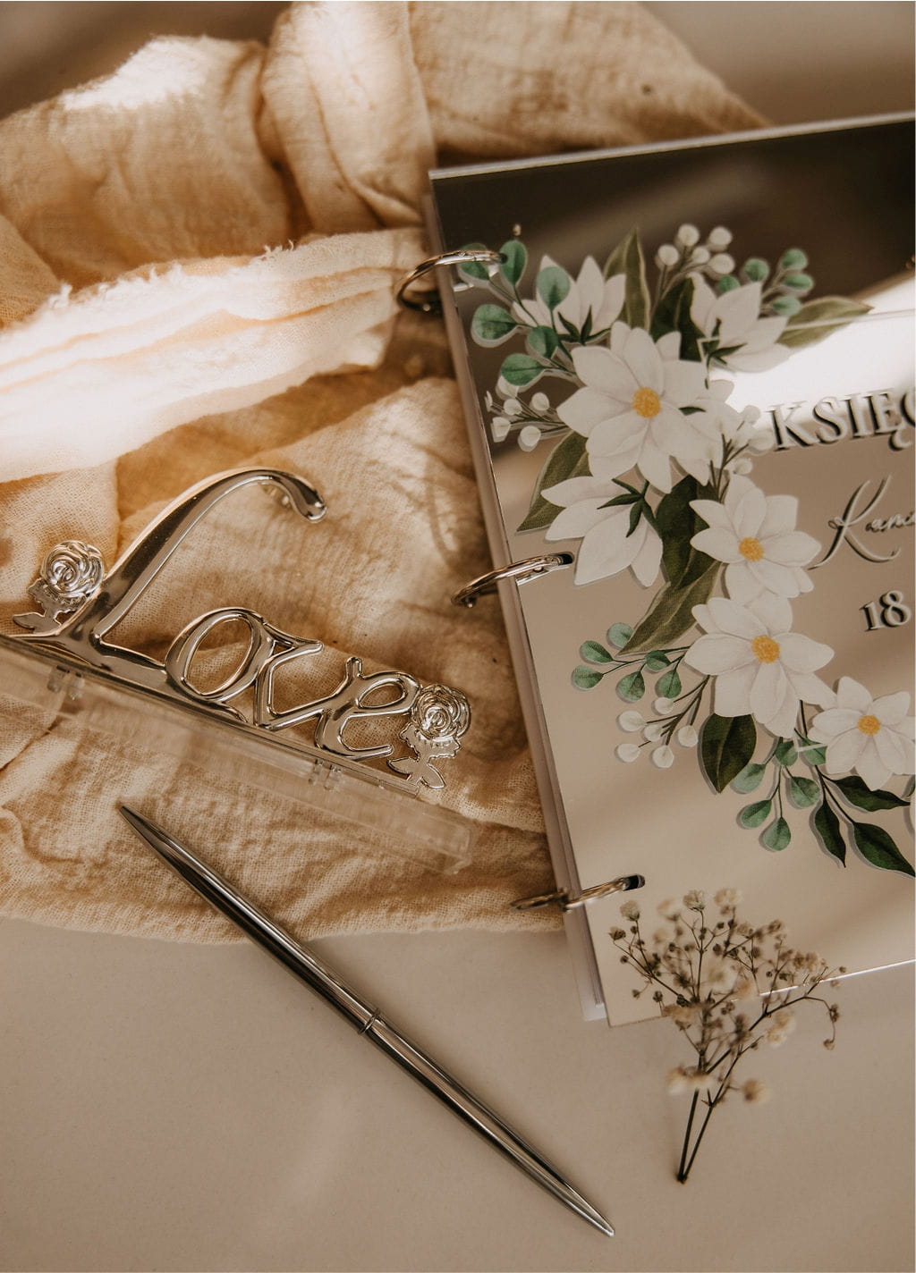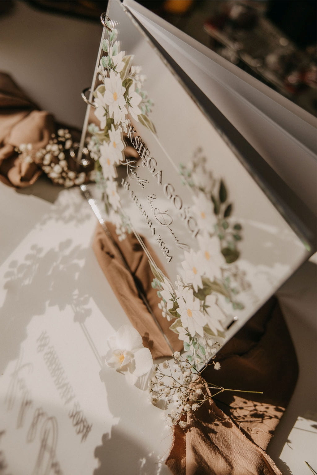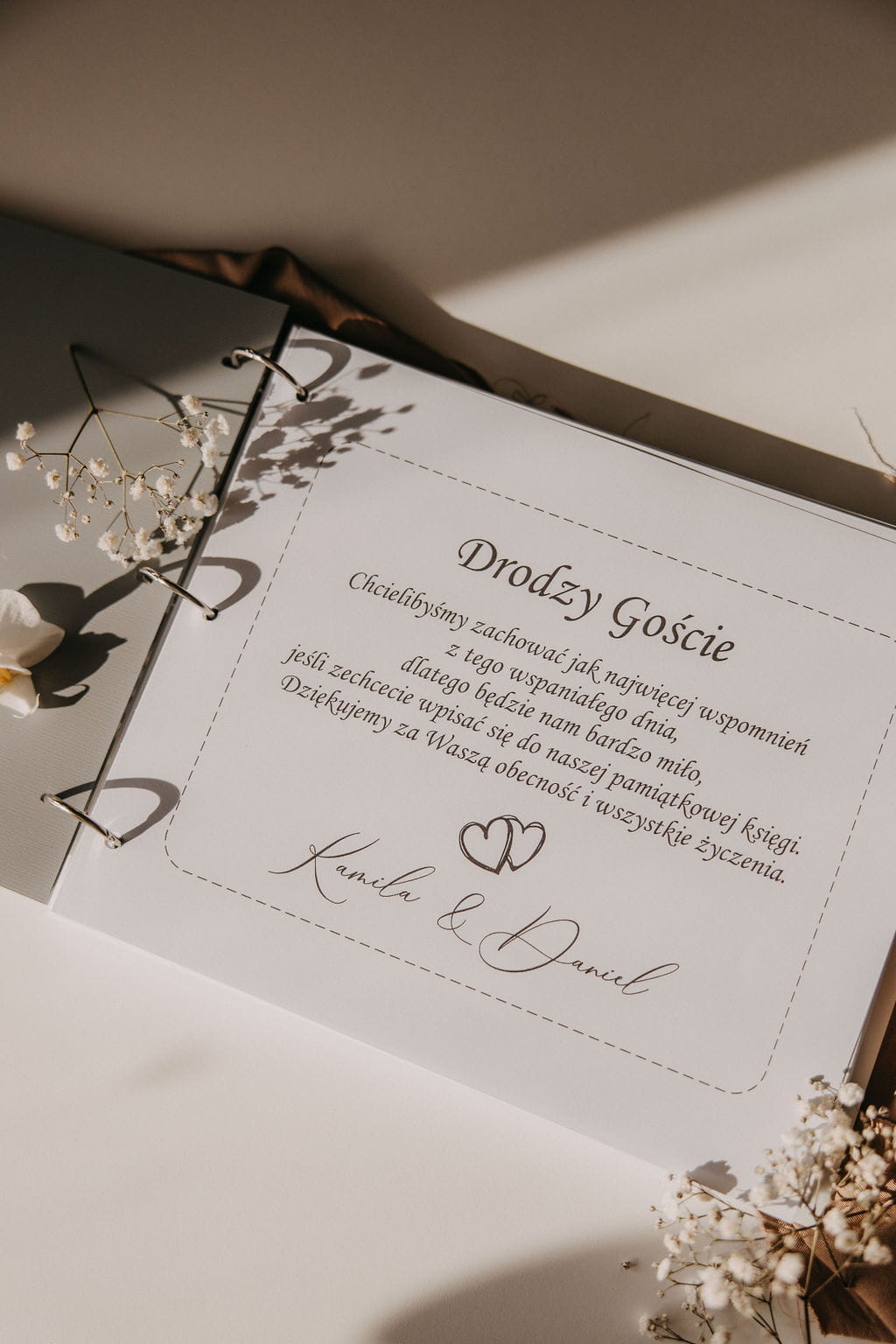 Księga gości jest nie tylko pięknym elementem dekoracyjnym, ale także funkcjonalnym pamiątką, w której goście mogą pozostawić swoje życzenia i wspomnienia z tego wyjątkowego dnia. Wewnątrz księgi znajdują się wysokogatunkowe kartki o gramaturze 200g zapewniającej komfort pisania. Świetnie nadaje się do wklejania zdjęć np. z fotobudki.