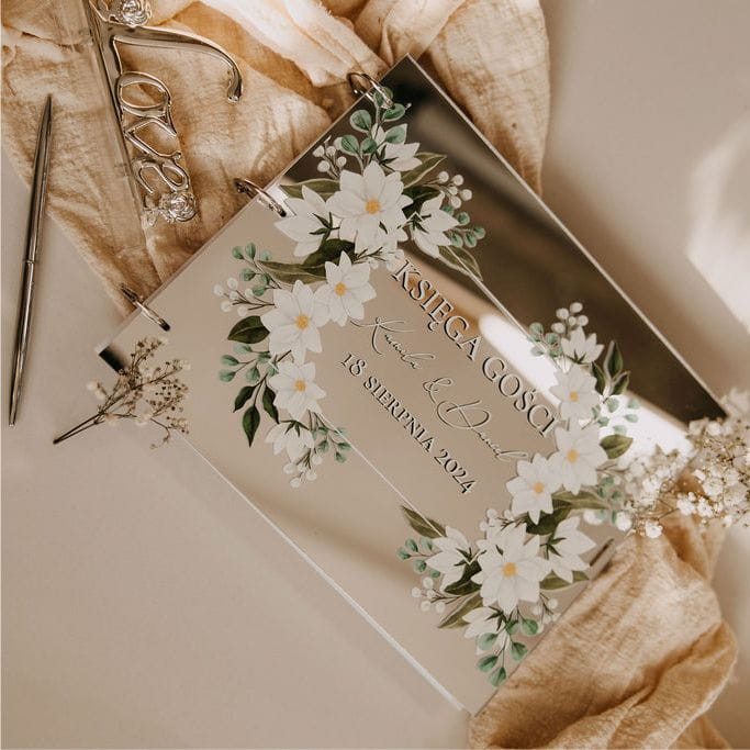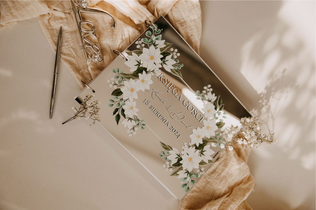 Lustrzana okładka personalizowana jest imionami pary młodej oraz datą ślubu, co czyni ją jeszcze bardziej unikalną i osobistą. Ta lustrzana księga gości to idealny sposób na zachowanie cennych wspomnień i życzeń od najbliższych. Po zakończeniu uroczystości stanie się wspaniałą pamiątką, do której można wracać przez lata, przypominając sobie magiczne chwile z dnia ślubu.