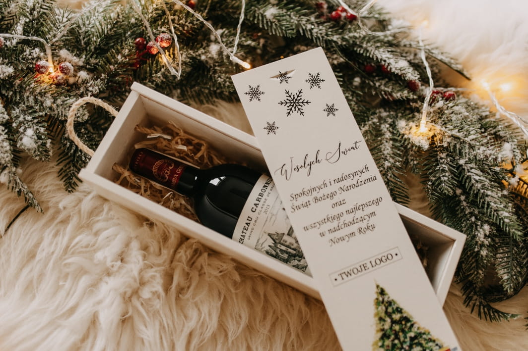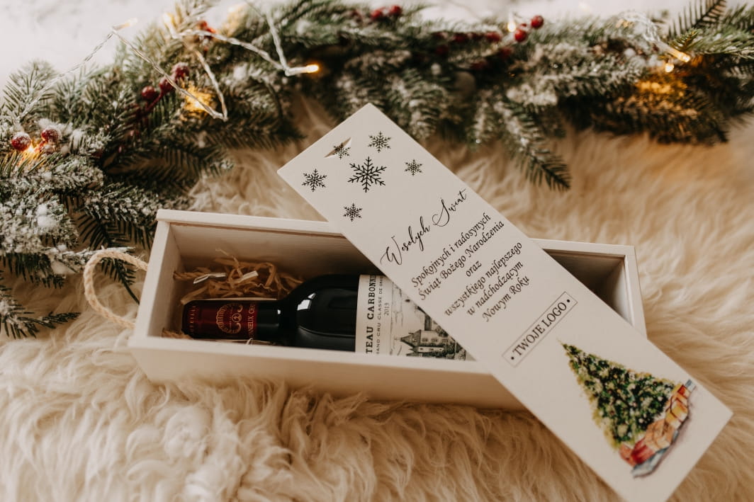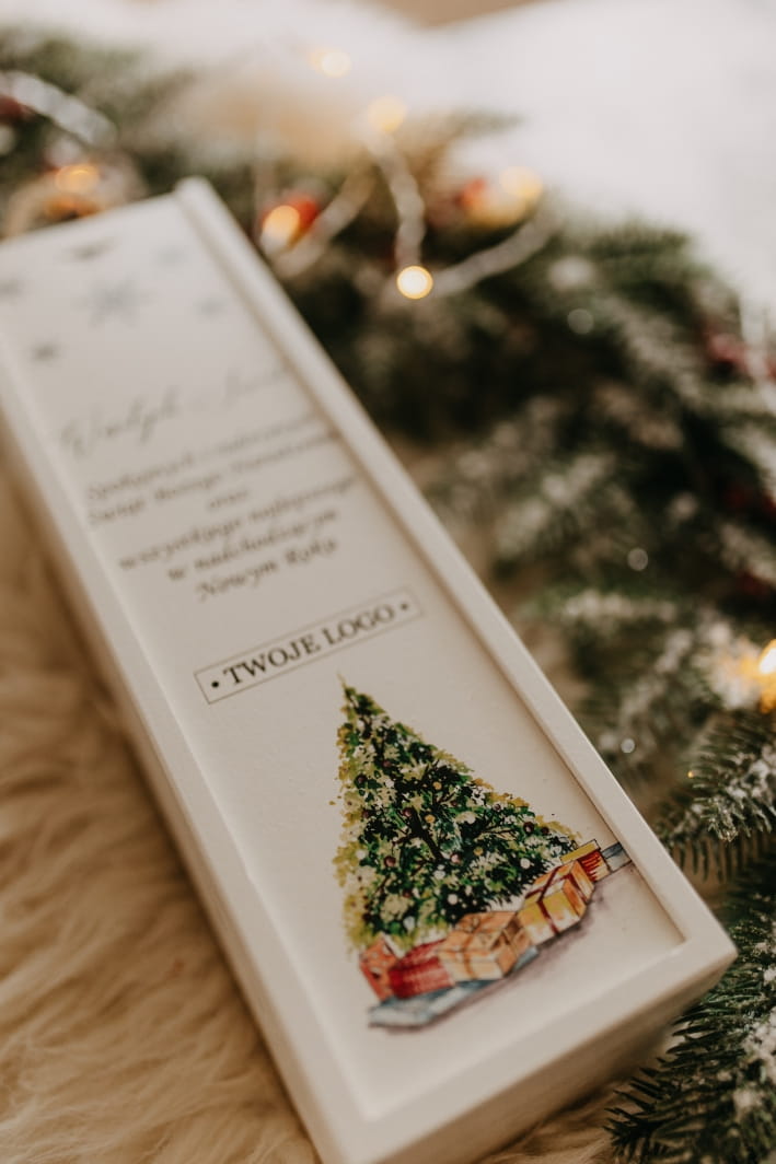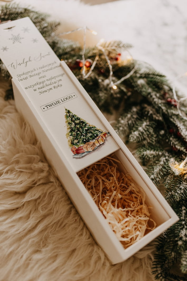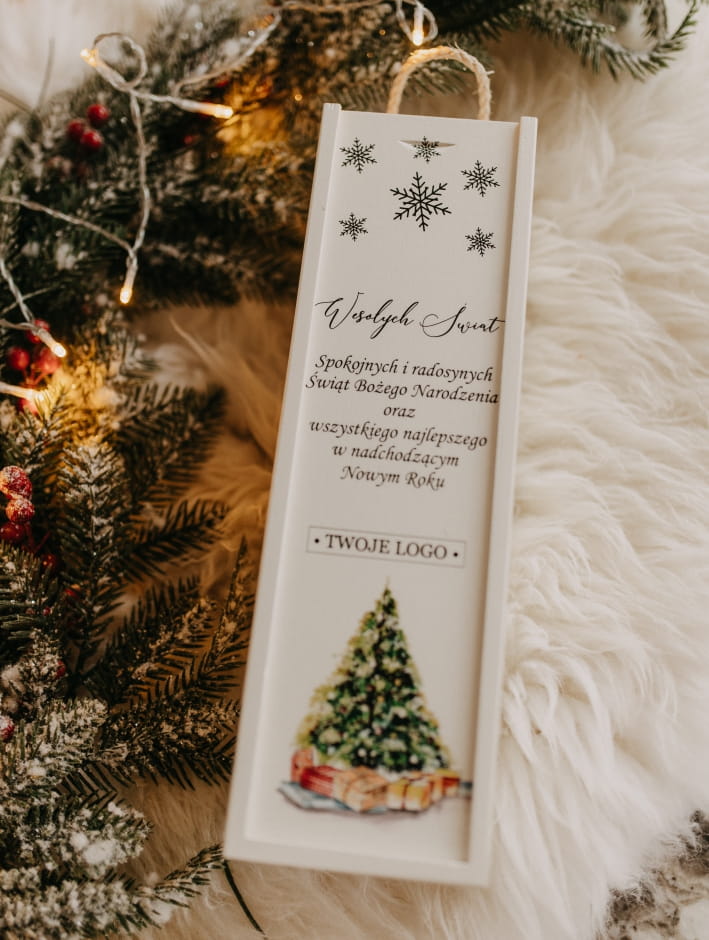 Co czyni ją wyjątkową? Możliwość personalizacji! Na froncie umieścimy Twoje logo oraz świąteczne życzenia, które sprawią, że ten produkt stanie się niezapomnianym prezentem dla klientów, pracowników lub bliskich. Skrzynka mieści standardową butelkę wina, chroniąc ją przed uszkodzeniami, a jednocześnie eksponując w elegancki sposób.
