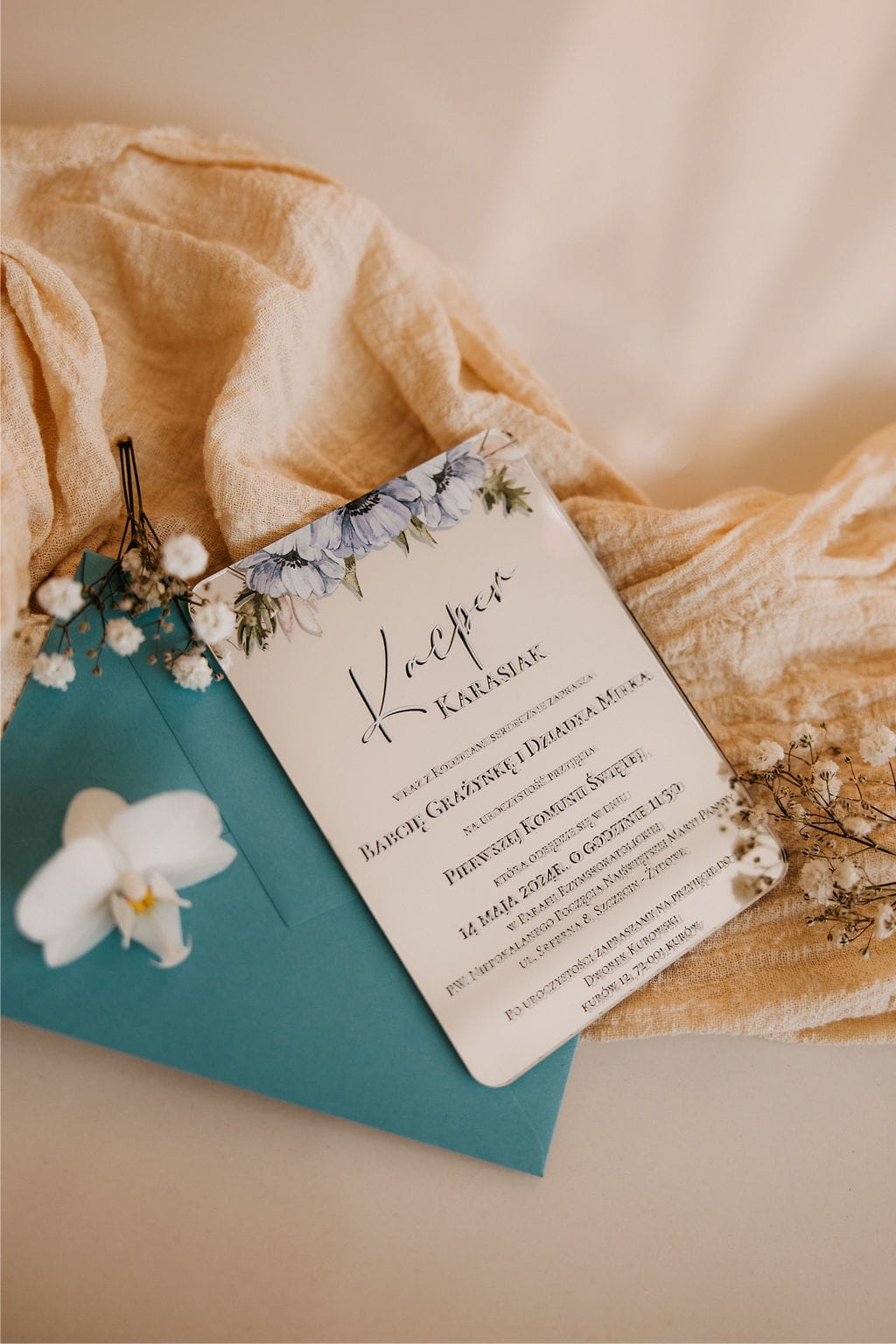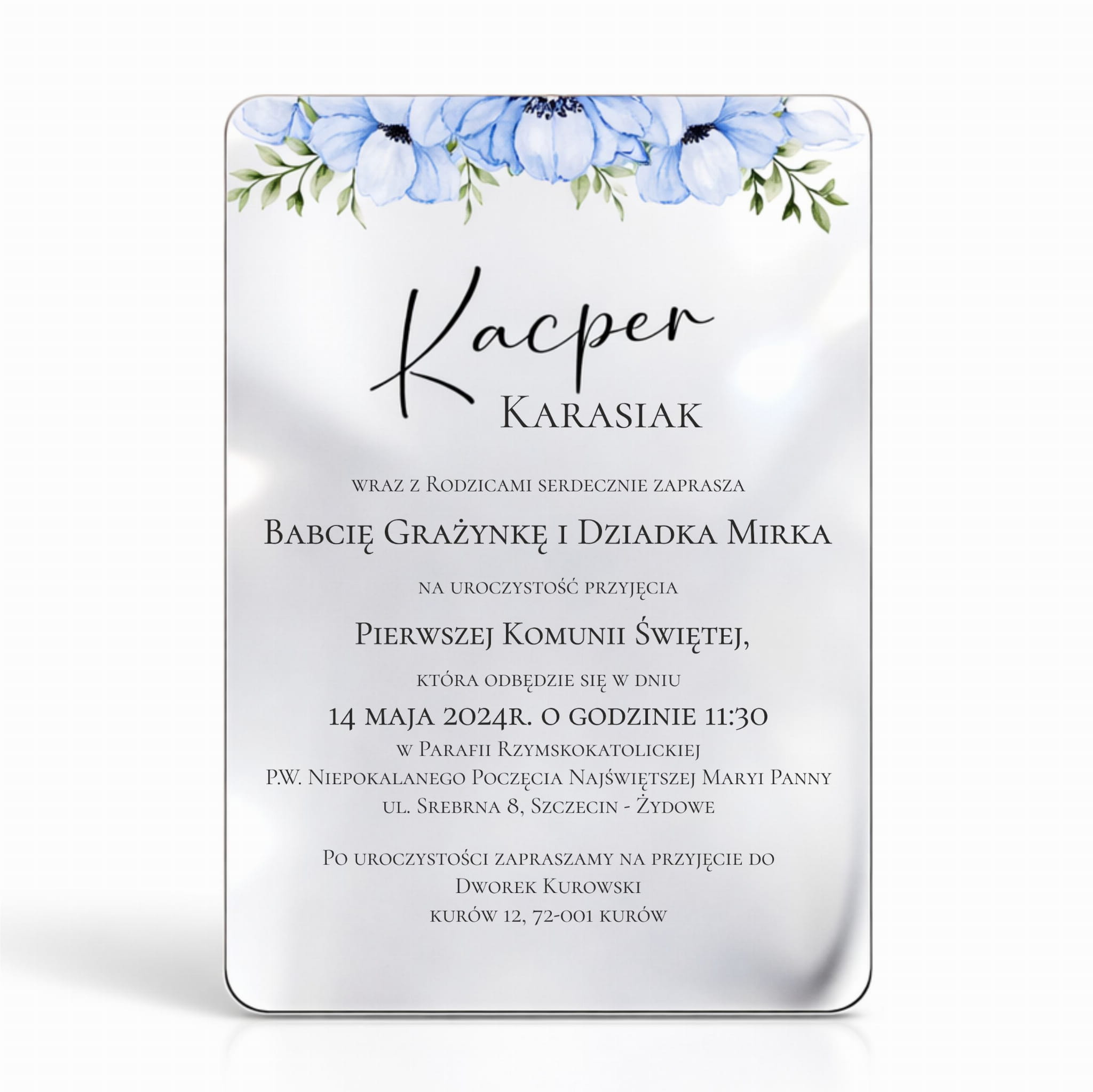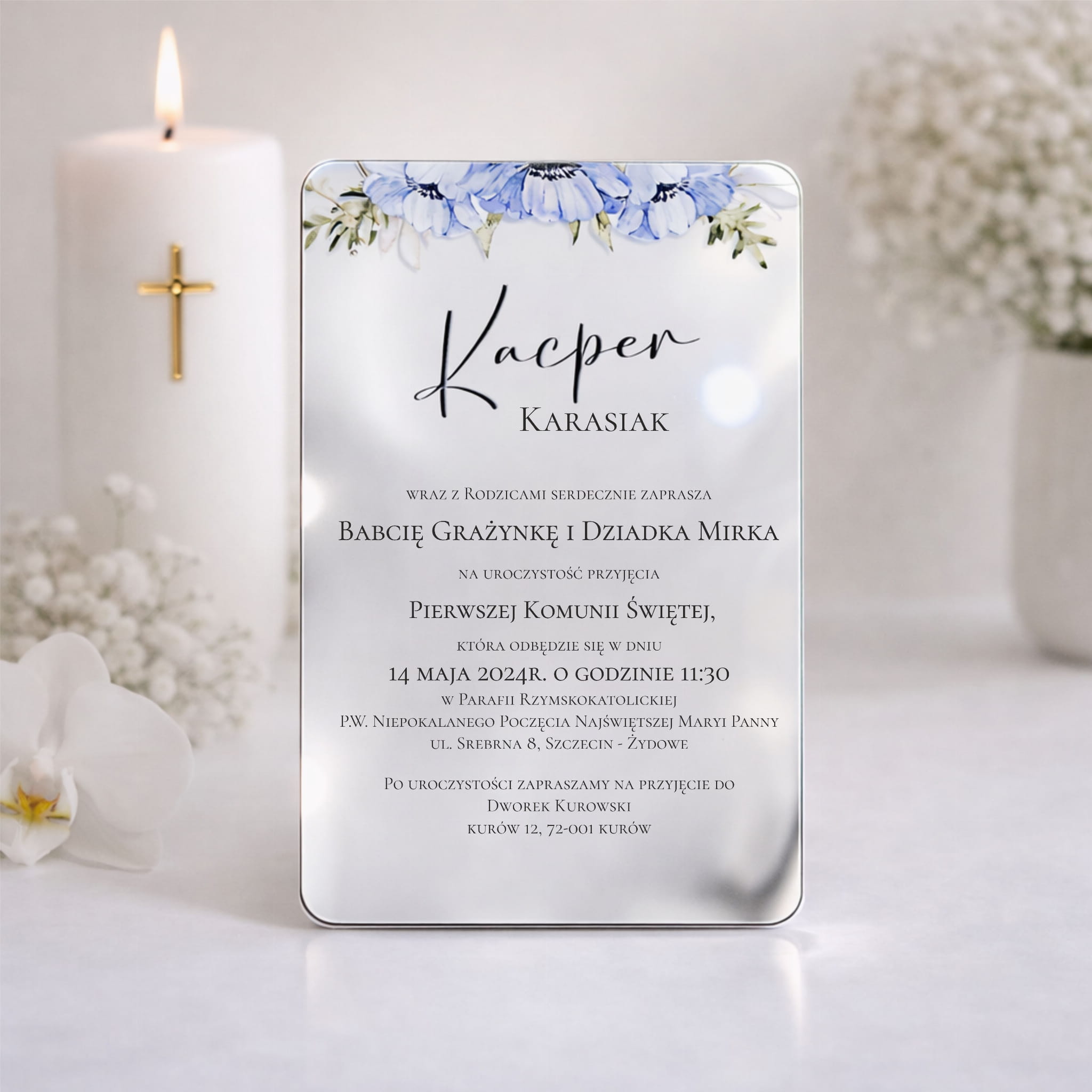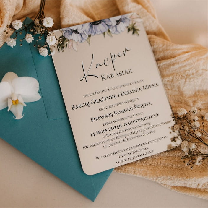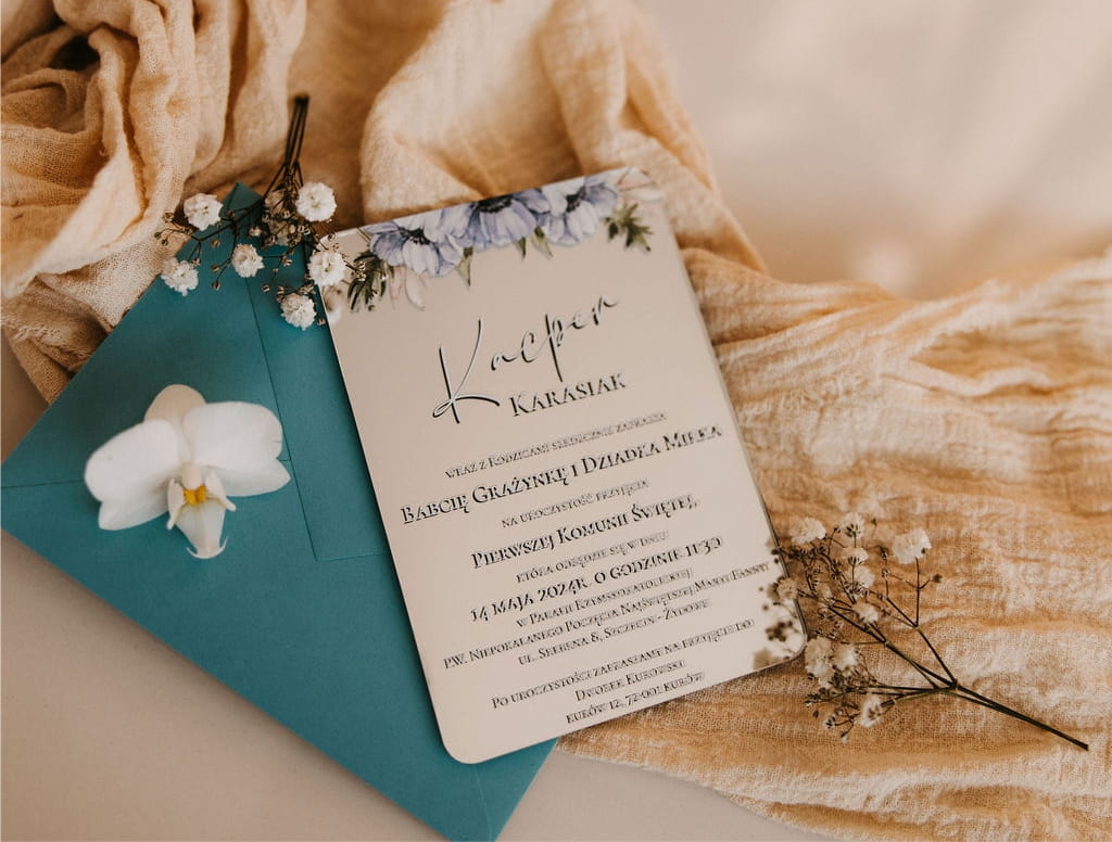 Lustrzane zaproszenie komunijne – elegancja w nowoczesnym wydaniu