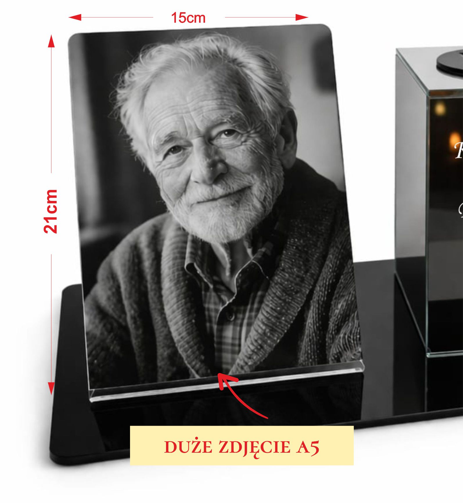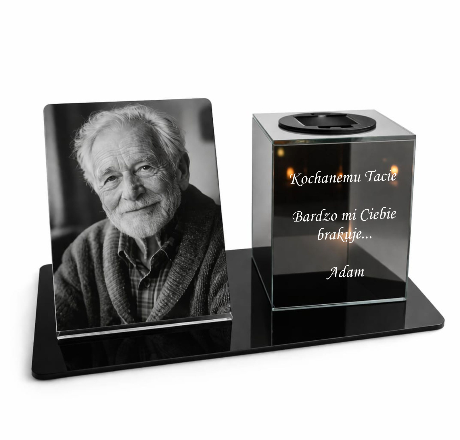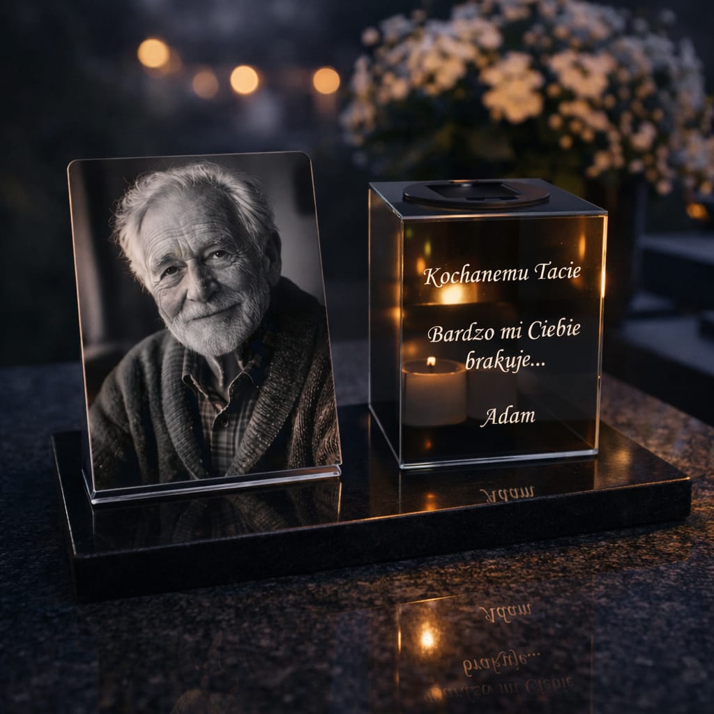 Elegancki zestaw pamięciowy, który łączy zdjęcie bliskiej osoby z subtelnym światłem lampionu solarnego. To nie tylko znicz – to osobista, pełna emocji forma upamiętnienia, która wyróżnia się estetyką i jakością wykonania.